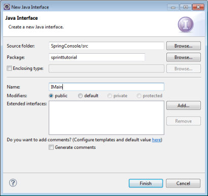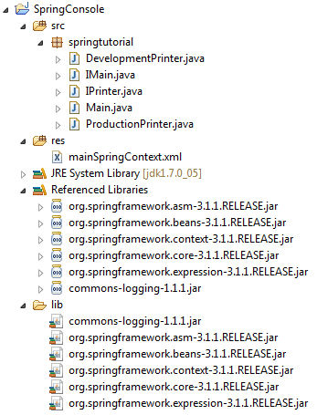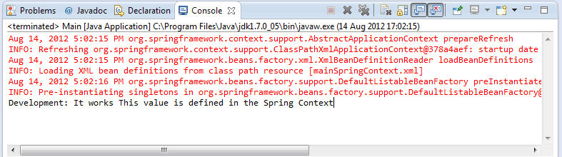 That concludes the first Spring application. In this example, dependency injection has been used to specify which IPrinter implementation the application should use. To change it from the bean devPrint to prodPrint, only the xml configuration file needs to be touched.