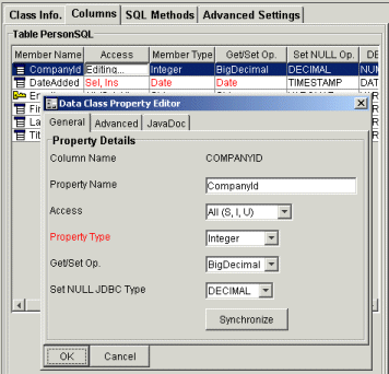 Below is the columns' view of the class. Defaults can be changed from here by double clicking on any entry in the table. In most cases only the access for a few columns will need their access changed to specify which columns to use in the SQL select, update, insert statements, and hence which ones appear in the generated data class.