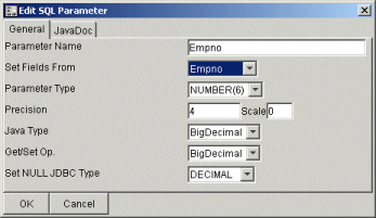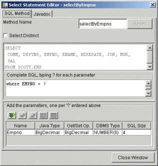 The JDBC class generated will have a method of the form void "selectByEmpno(BigDecimal CustomerID)", in order to specify this the Select Statement Editor is used.