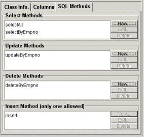 From this tab we can specify new database access methods, delete them, or modify existing methods. The next section walks through the creation of a Select method.