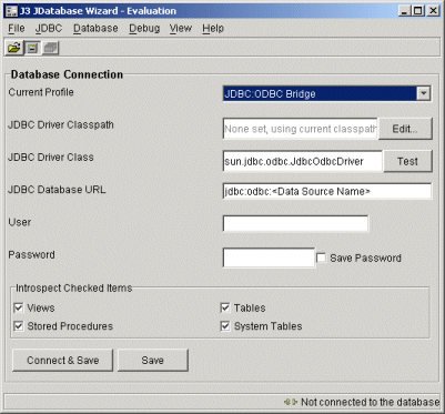 The Profile drop down list box can be used to initialise the other fields. In the above example the JDBC:ODBC bridge is chosen to initialise the other fields. In the example above, the database URL needs the <Data Source Name> to be changed to the actual datasource used.
